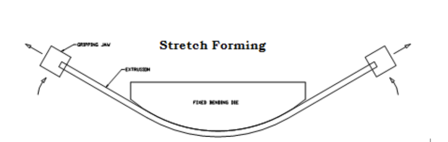 During stretch forming, an extrusion is placed along a rounded, fixed bending die and clamped in place on each end. The machine begins to swing the clamped ends downward to angles up to 180 degrees, and the extrusion is bent around the die to reach the desired form.