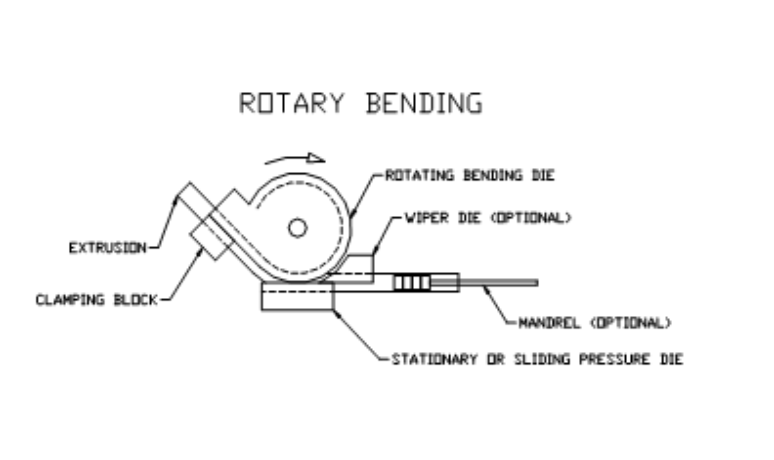 In the hydraulic rotary draw bending process, manufacturers place extruded aluminum onto a bender and hold it in place with a stationary or sliding pressure die and clamping block. The round bending die, powered by hydraulics, is rotated up to 90 degrees, bending the extrusion as it rotates. With this method, an extrusion can only be bent one radius at a time.